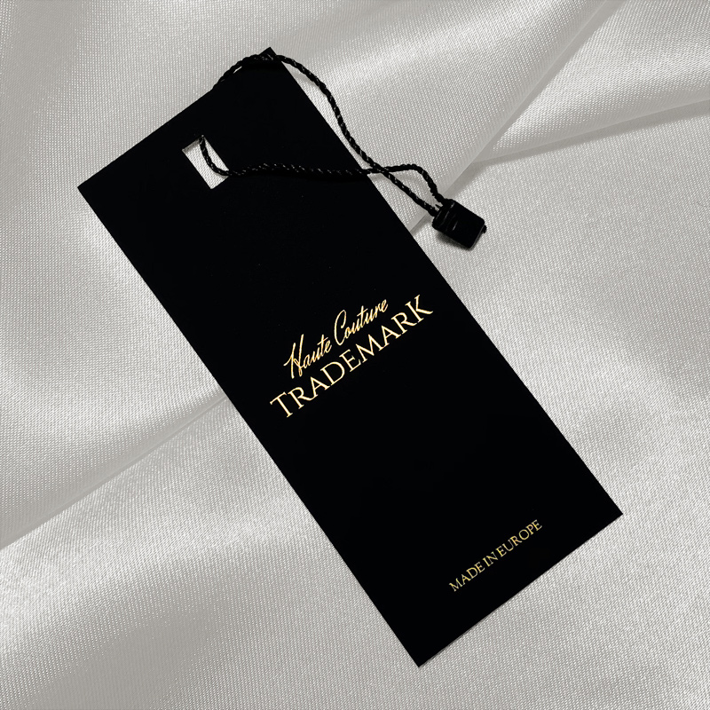 Étiquette noire avec écriture dorée en carton épais laminé Soft Touch, avec cordon et sceau en plastique inclus, adaptée à divers produits vestimentaires. Ce type d'étiquette est fabriquée en matériaux de haute qualité, utilisant les technologies les plus avancées dans le domaine de l'impression Digitale et finissage.