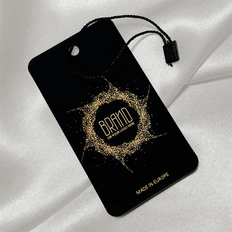 Étiquette de vêtements modèle HT-M95 munie d'un sceau et d'un corde en polyester pour suspendre les vêtements, personnalisée avec écriture dorée sur carton laminé avec feuille noire. Ce type d'étiquette est fabriquée en matériaux de haute qualité, utilisant les technologies les plus avancées dans le domaine de l'impression Digitale et finissage.