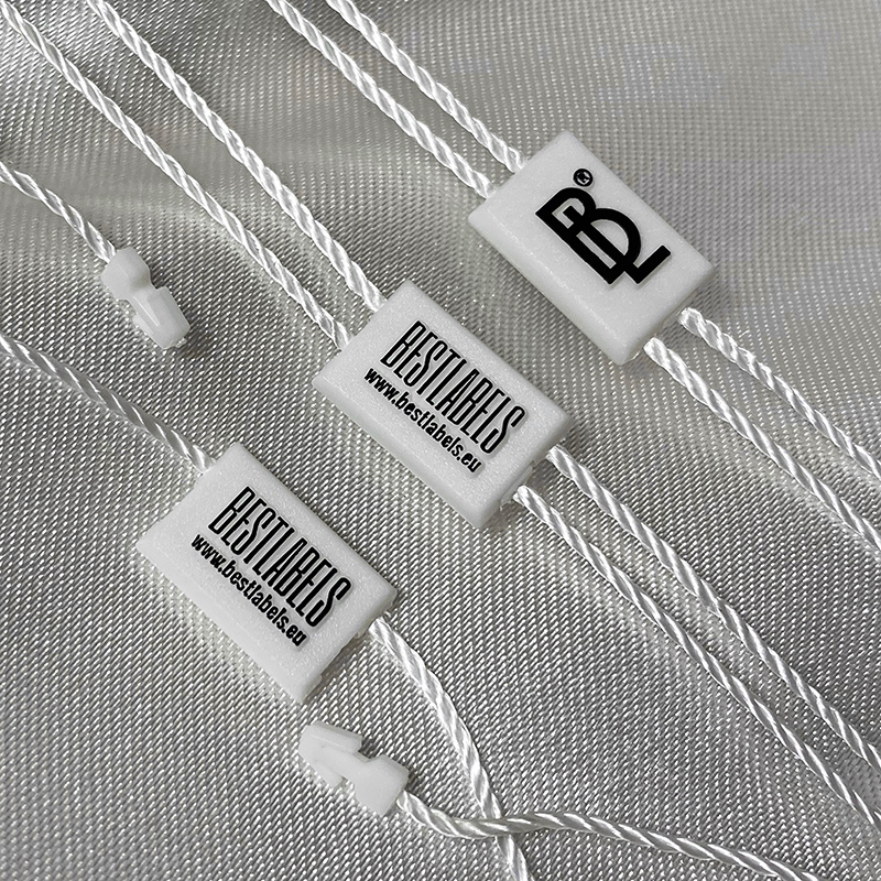 Scellé en plastique ST-M174 de forme rectangulaire simple, personnalisé avec un texte, le nom de la Marque, le site web, etc., ainsi qu'un logo/emblème, adapté à tout type de produit dans le domaine textile, de l'habillement, des chaussures, des sacs. Ce modèle de scellé est fabriqué en matériaux de haute qualité, utilisant les technologies les plus avancées de ce domaine.